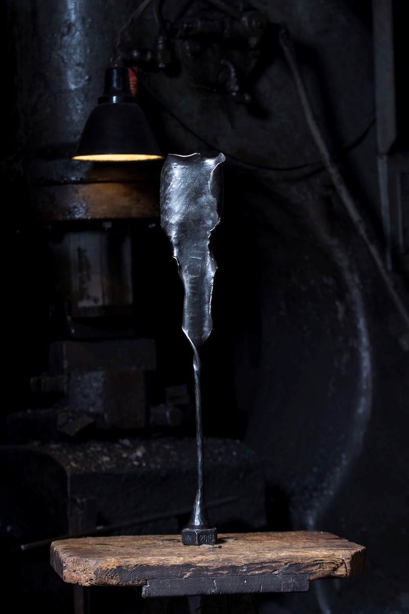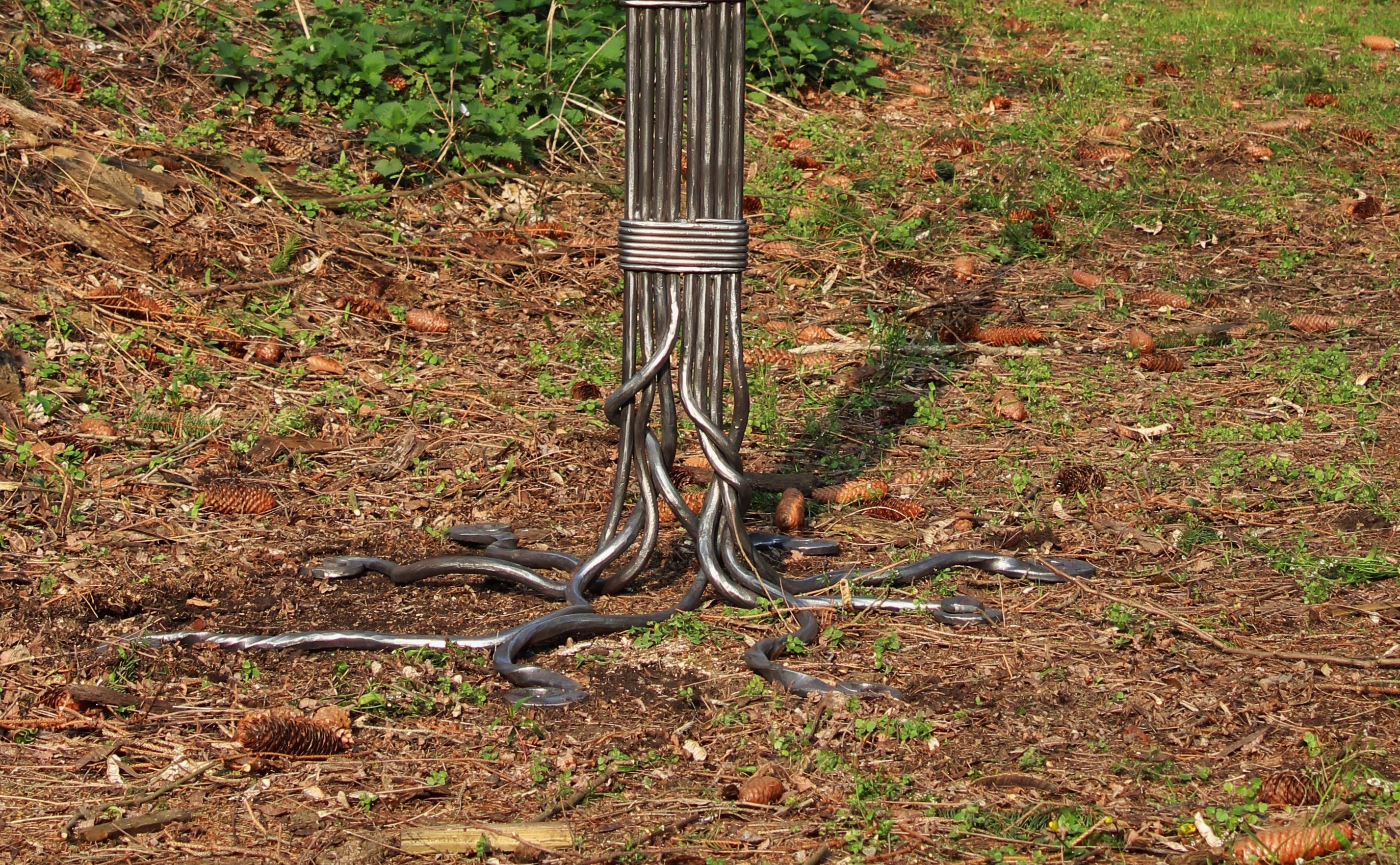 Ich arbeite oft und gerne mit Zufällen vom Schrottplatz. Ein Stück Stahlträger, überdimensionierte Schrauben, Zahnräder oder Kettenglieder warten in meiner Werkstatt auf eine Idee und Umsetzung. Die Technik der seit dem 19-ten Jahrhundert konstruierten Schmiedemaschinen macht es möglich, sehr große Materialquerschnitte rational zu verformen. 240 rhythmische Schläge in der Minute und eine feinfühlige pneumatische Steuerung des "Hammerbärs" setzt der Schmiedekunst keine Grenzen, das Material wird wie Knete geformt.